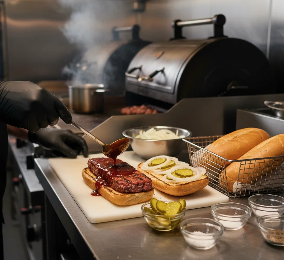Slice slab into sandwich-sized ovals (or shape with ring mold). Sear on hot griddle or roast at 180°C / 350°F until internal 71–74°C. Brush with sauce and char or broil briefly.