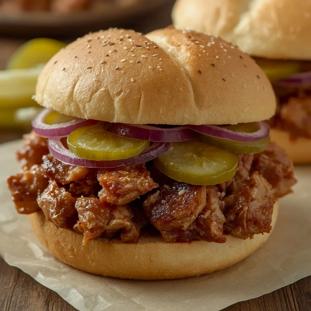 Assemble: bun → generous BBQ sauce → pork slab → extra sauce → onions → pickles → top bun.